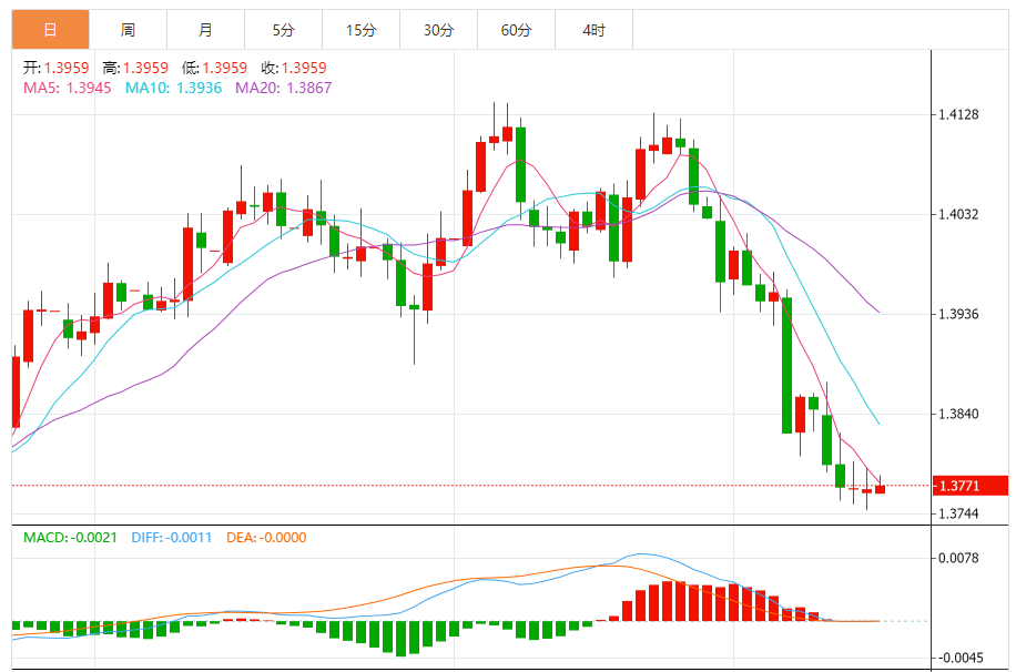 周二,美元/加元徘徊于1.3773下方,现交投于1.3771附近,涨幅0.03%。