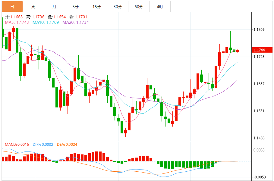 周四,欧元/美元徘徊于1.1746下方,现交投于1.1744附近,涨幅0.04%。