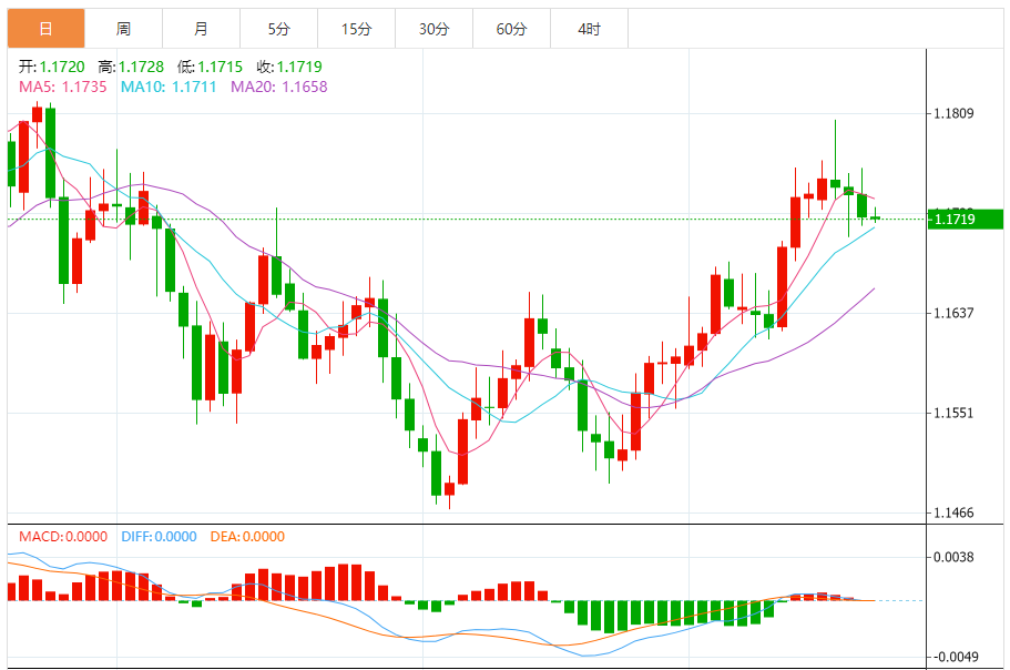 周五,欧元/美元徘徊于1.1720下方,现交投于1.1719附近,跌幅0.01%。