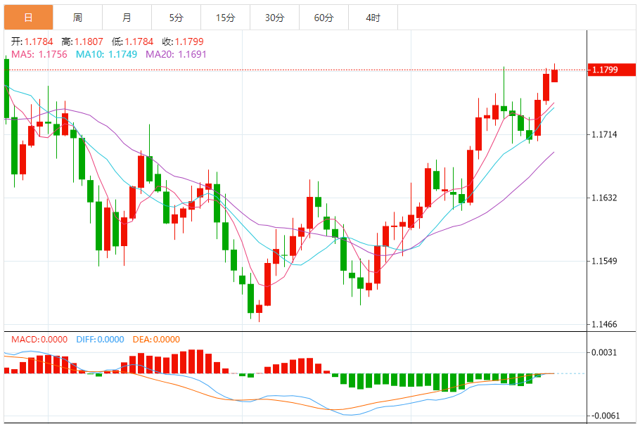 周三,欧元/美元徘徊于1.1802下方,现交投于1.1800附近,涨幅0.06%。
