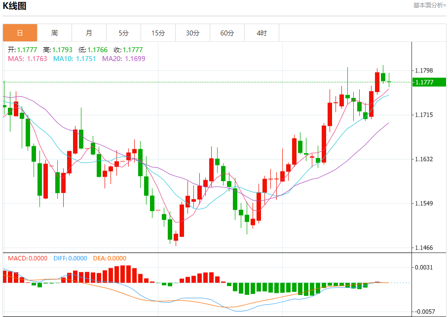 技术点评:RSI技术指标小于中性区域50。 MACD技术指标处在其信号线之下看空。 配置为负。 此外,价位低于其20天及50天移动平均线 ( 分别位于1.1787 和1.1790 )。