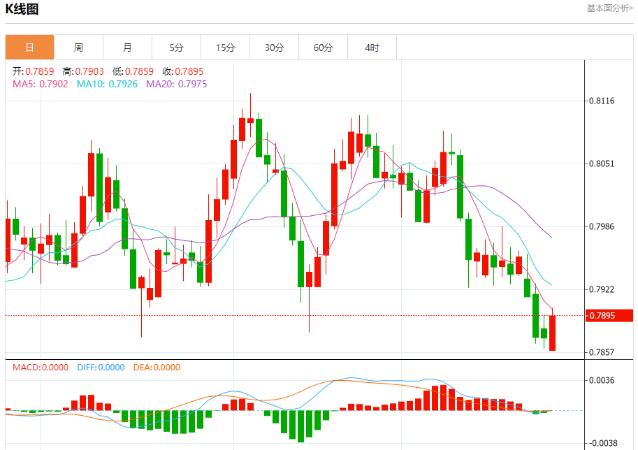 技术点评:RSI技术指标大于中性区域50。 MACD技术指标处在其信号线之上看多。 配置为正。 此外,价位高于其20天及50天移动平均线 ( 分别位于0.7877 和0.7876 )。