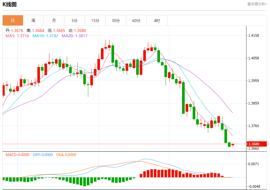 技术点评:RSI技术指标小于中性区域50。 MACD技术指标处在其信号线之上看空。 混合配置。 另外,价位低于其50天移动平均线 (1.3682 ) 但高于其20天移动平均线 (1.3675 )。