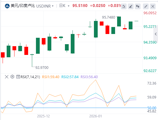 截至撰写时,美元兑印度卢比在90.3810附近下行。价格守在20日指数移动平均线(EMA)90.29上方,维持短期上行偏向。20日均线微幅上涨,支撑着阻力最小的上行路径。