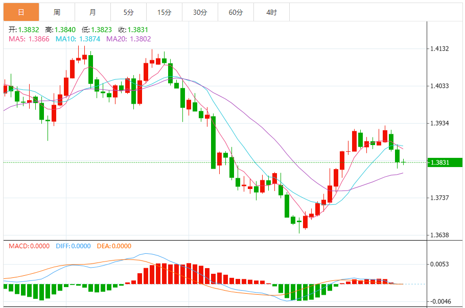 周三,美元/加元徘徊于1.3834下方,现交投于1.3831附近,跌幅0.00%。