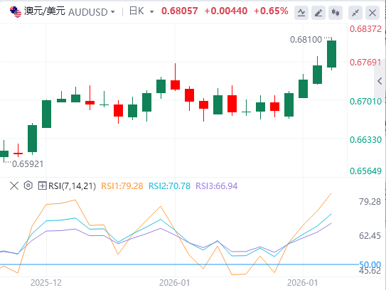 澳元/美元日线图分析显示该货币对在上升通道形态内上涨,显示持续的多头偏向。此外,九天指数移动平均线(EMA)突破50日均线,现货价格守在两者之上,强化了看涨基调。这种对齐保持了上行压力。14天相对强弱指数(RSI)位于69.93,接近超买,显示动能被拉长。
