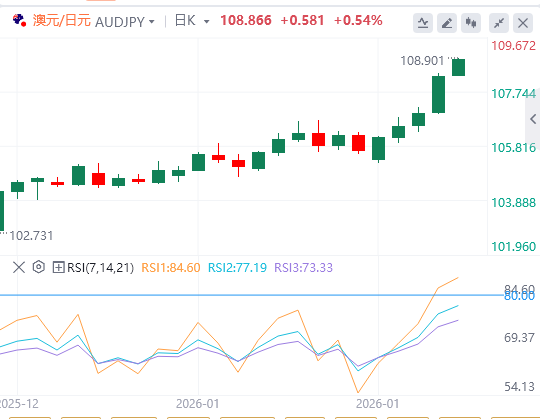 日线图中,澳元/日元维持在102.07的100日均线上方,凸显出强烈的多头倾向。正斜率支持延续,而与平均值的距离则警示均值回归风险。价格已突破108.10上布林带,显示出在强烈上行压力下,市场状况紧张。这些区间持续扩大,反映出波动性上升和加速趋势。