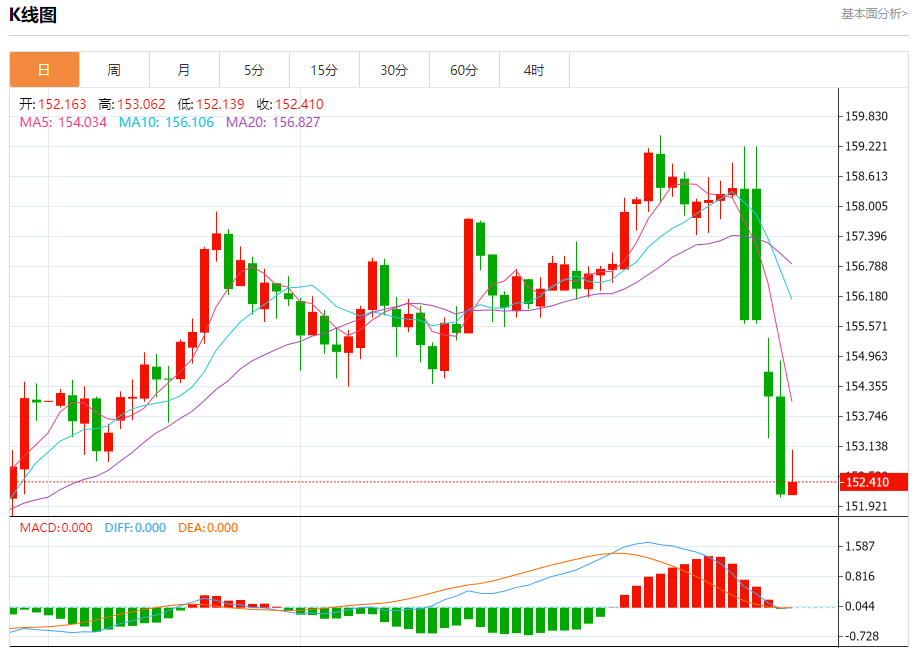 今日周三,欧元兑美元报1.1979,跌幅0.54%;英镑兑美元报1.3780,跌幅0.48%;美元兑日元报152.554,涨幅0.24%。