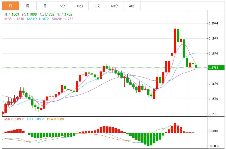 周四,欧元/美元徘徊于1.1789下方,现交投于1.1787附近,跌幅0.17%。