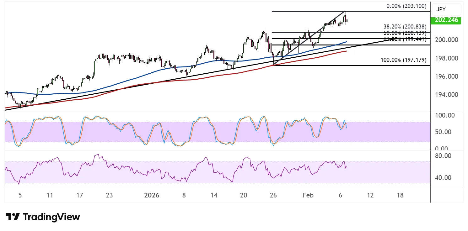 该趋势线与斐波那契回撤位的一组重合,这可能足以吸引新的买盘兴趣。38.2%的斐尔波段位于200.83,而50%水平则与200.00附近的突破阻力位对齐。这一心理水平也对应于曾经的盘固区,现在可能成为支撑。