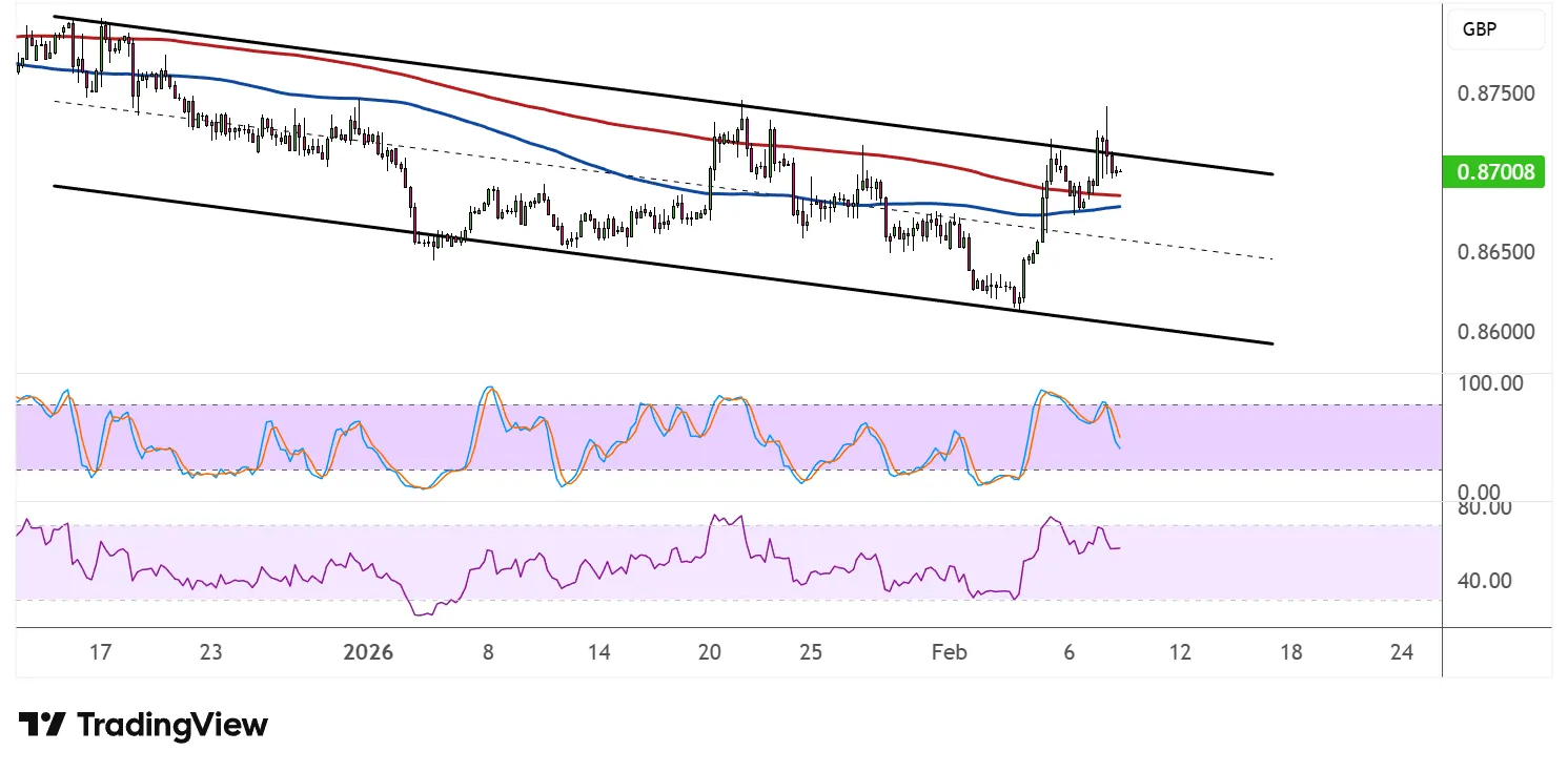 该货币对目前徘徊在通道顶部附近,该区域与0.8700心理手柄附近的关注区域重合。若该阻力区出现拒绝,可能确认空头压力依然存在,并触发继续滑回通道底部。
