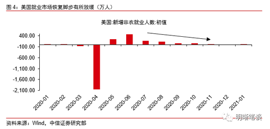 对于当前美国政策发力的重点由货币政策转向财政政策的原因,从美联储两大政策目标的角度来看,在宽松货币政策之下,美国通胀预期上升明显,但美国就业形势仍旧较为严峻,因此就业问题可能是美国政府推动财政发力的重要原因。如何看待的当前美国政策的发力重点由货币政策转向财政政策?对于这个问题我们认为从美联储制定货币政策的两大政策目标当中或许能够获得答案。美联储的两大政策目标,一方面盯住通胀指标,另一方面则盯住就业指标。通胀方面,当前美国通胀预期持续上行,春节过后市场关于再通胀交易的讨论也日渐热烈。而与通胀预期持续上行形成对比的是,自去年4月美国就业市场遭受疫情大幅度冲击以后,虽然后续在政策发力的支撑下美国就业市场也经历改善,但当前美国就业市场的恢复脚步有所放缓,就业形势仍旧较为严峻,而针对就业问题,相较货币政策,财政政策的发力效果或更为显著,因此就业问题可能是美国政府推动财政发力的重要原因。