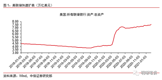 从疫情发生的时间轨迹上来看,疫情发生后全球主要经济体快速启动政策应对,在货币政策与财政政策配合之下,货币政策或为疫情初期的主要发力点。以美国为例,去年三月伊始,美联储便打出了“零利率+无限QE”的组合拳,同时,还推出了CPFF、PDCF、MMLF等近十项流动性或信用支持工具,充分利用货币政策提振宏观经济。财政政策方面,去年12月之前美国政府当局通过财政政策提供了近3万亿美元规模的救济,与强势的货币政策双管齐下,刺激美国经济的修复。但从政策力度和市场影响上来看,货币政策或为疫情初期的主要发力点,在“零利率+无限量QE”组合下,美联储资产负债表实现了大幅快速扩张。