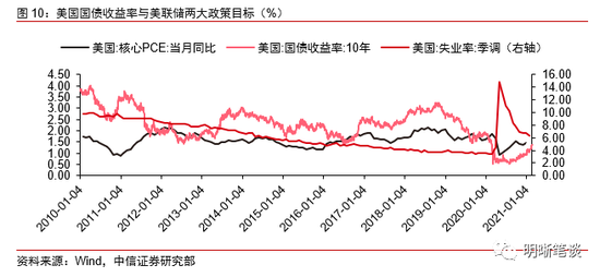 对于美国后续的财政与货币政策组合,货币政策方面我们认为在当前就业市场缺乏进一步改善的背景下,货币政策或仍将维持宽松,鲍威尔也表示将坚定致力于尽所能促进充分就业。在货币政策方面,当前美国通胀预期持续走高,市场对于美联储货币政策转紧的担忧始终未能打消。对比同样出现通胀上行和美债收益率走升的2018年,美联储在当年进行了多次加息操作,而2018年和当前非常重要的一个区别在于,2018年美国劳动力市场表现强劲,失业率水平仍处于不断降低的过程当中。鲍威尔在讲话当中强调强大的劳动力市场是一个值得追求的目标,并表示仍将坚定地致力于尽所能促进充分就业,因此我们认为在当前就业市场缺乏进一步改善的背景下,美国货币政策或仍将维持宽松。