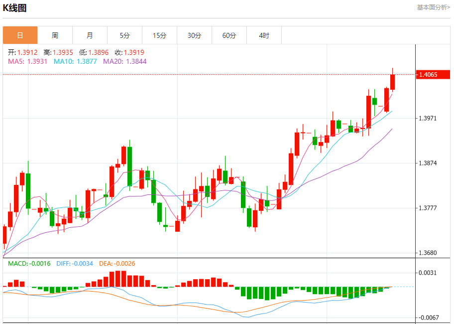 截至目前,美元/加元上涨0.20%,报1.4066。