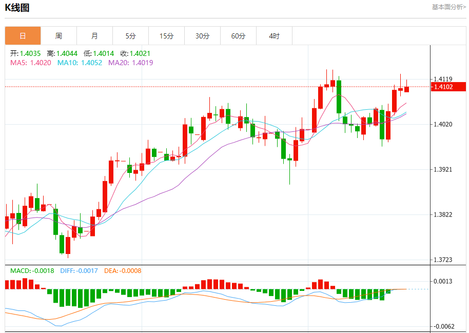 截至目前,美元/加元上涨0.02%,报1.4103。