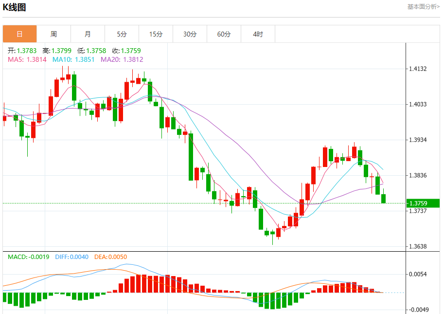 截至目前,美元/加元下跌0.15%,报1.3765。