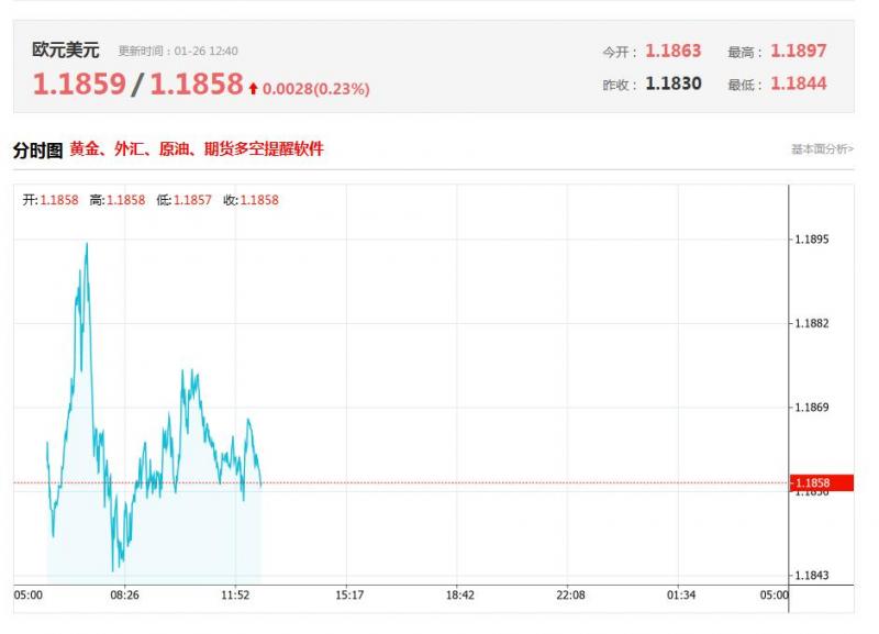 截至目前,欧元/美元上涨0.23%,报1.1858。