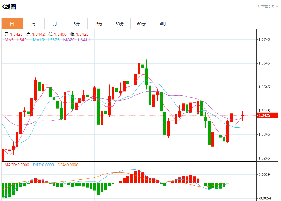 周一盘中,英镑/美元报1.3425,涨幅0.02%。