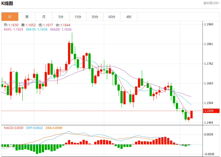 周四盘中,欧元/美元报1.1528,涨幅0.32%。
