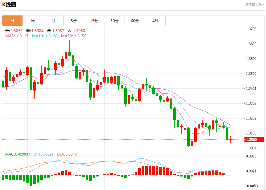 周四盘中,英镑/美元报1.3062,涨幅0.03%。