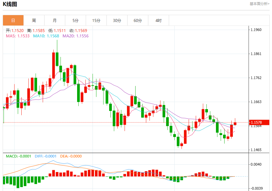 周三盘中,欧元/美元报1.1572,涨幅0.02%。