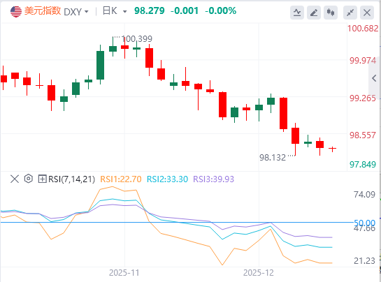 美元指数在八周低点附近徘徊,该指数跟踪美元兑六大货币的价值,约为98.15。