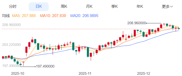 周三,英镑/日元下跌0.11%至207.46附近。