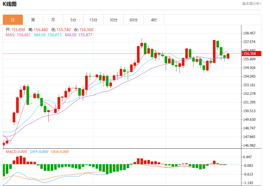 技术点评:RSI技术指标大于中性区域50。 MACD技术指标处在其信号线之上看空。 MACD必须突破其零位,才能触发进一步的上涨。 此外,价位高于其20天及50天移动平均线 ( 分别位于155.90 和155.97 )。