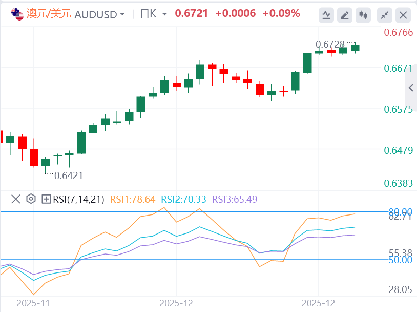 直接阻力位于0.6727,为2024年10月以来最高,而日线基调保持在移动平均线上方。若突破该水平,将支持澳元/美元对探索上升通道上界附近0.6830的区域。