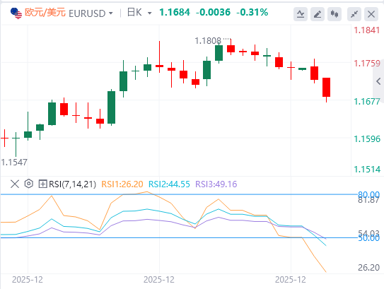 欧元兑美元已将调整幅度从1.1800高点延伸至4周低点,跌破1.1700,技术指标显示将进一步下跌。4小时相对强弱指数(RSI)接近35,移动平均收敛背离(MACD)显示红色条,显示出强烈的空头动能。