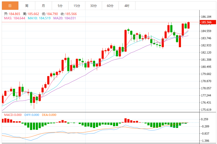 技术上,欧元兑日元对受益于184.75支撑上方的积极稳定,为形成强劲的牛市提供了新的机会,在185.50水平攻击顶部,为恢复近中期交易的牛市趋势找到出口。