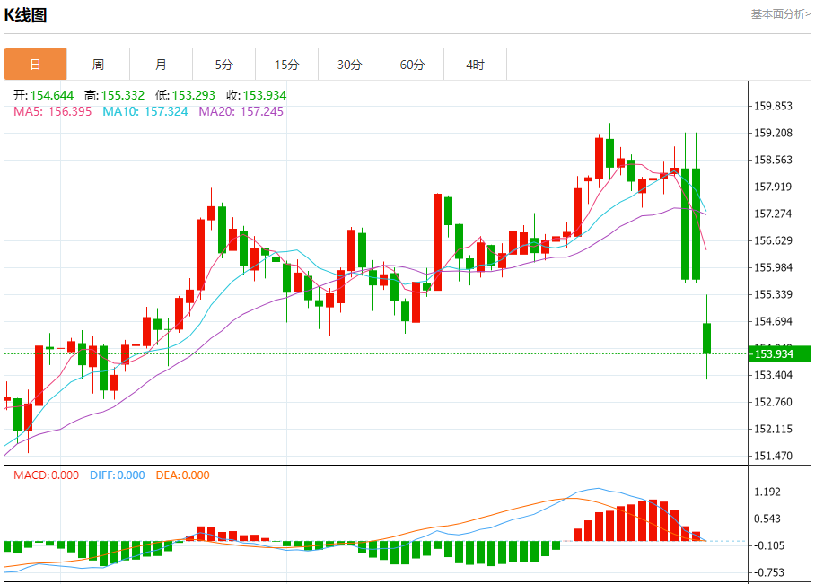 周一盘中,美元/日元报154.072,跌幅1.02%。