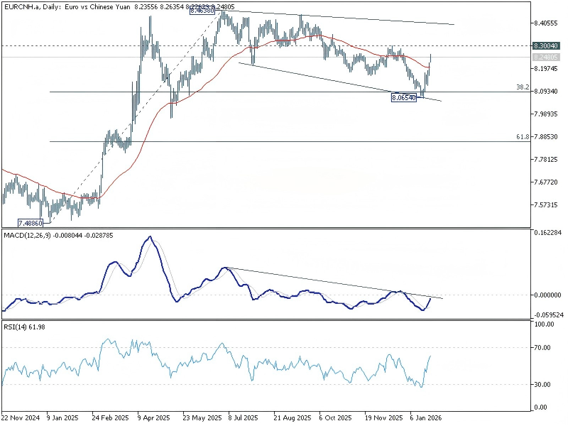 从技术上讲,交叉费率也呼应了这一说法。在欧元/人民币,过去两天的强劲反弹以及明显突破55日均线8.2025,表明从8.4638的修正回撤已完成,该回调已在8.0654,38.2%的回调,从7.4886(2025年最低点)回调到8.4638(2025年高点)8.0913。近期关注点现为8.3004,若在此坚实突破,将为8.4638高点的重测打开大门。