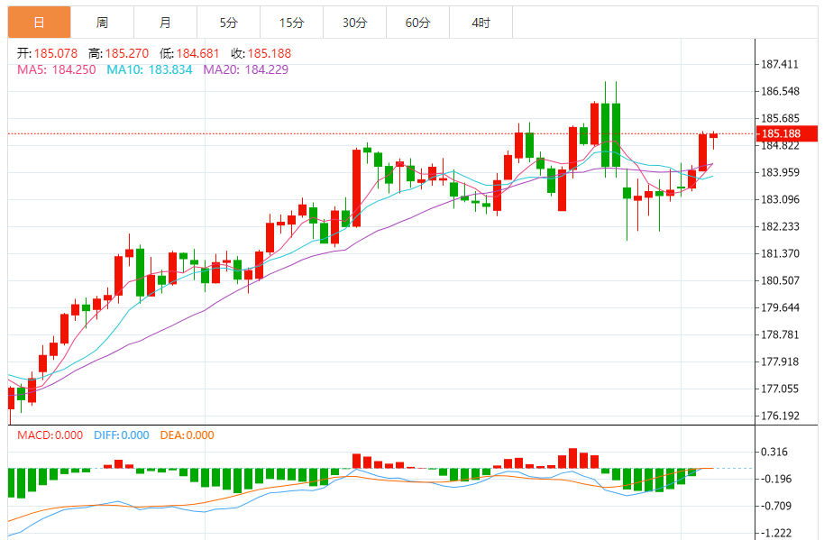 周四,欧元/日元上涨0.01%至185.221附近。