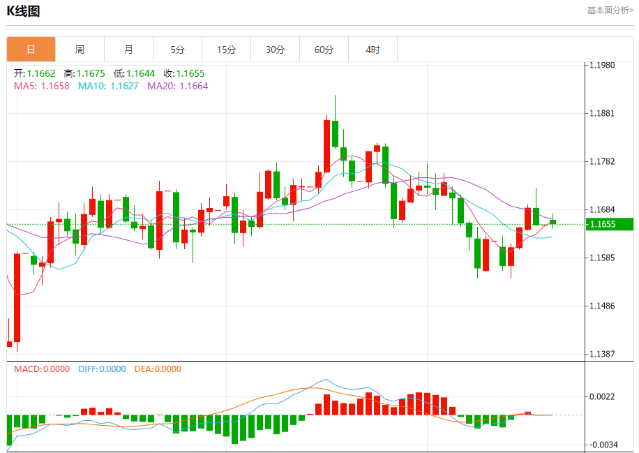 汇价高见1.1675,低见1.1644。上一交易日,汇价收于1.1654。