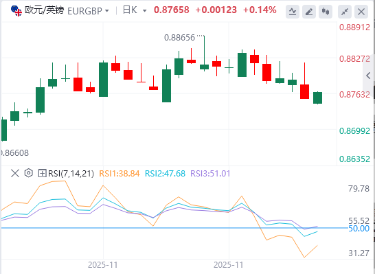 欧元紧抓着11月底反弹后61.8%的斐波那契回撤0.8743,但上涨机会有限,10月27日低点0.8720仍受空头关注。进一步往下,上述周期的78.6%斐波那契回撤位为0.8710。