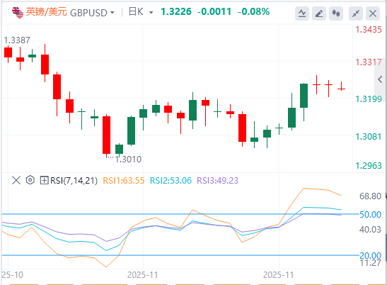 日线图中,英镑/美元交易于1.3225。100日均线下行至1.3307,封顶上方,保持整体下行趋势。要实现反弹,需要持续收盘高于该平均线,才能缓解空头压力。价格位于布林包层上半部,区间略幅宽,显示动能有所改善。RSI在52.88仍高于50,但已从54.94回落,短期冲动降温。直接阻力为上轨1.3273,中轨1.3147和下轨1.3020为支撑。