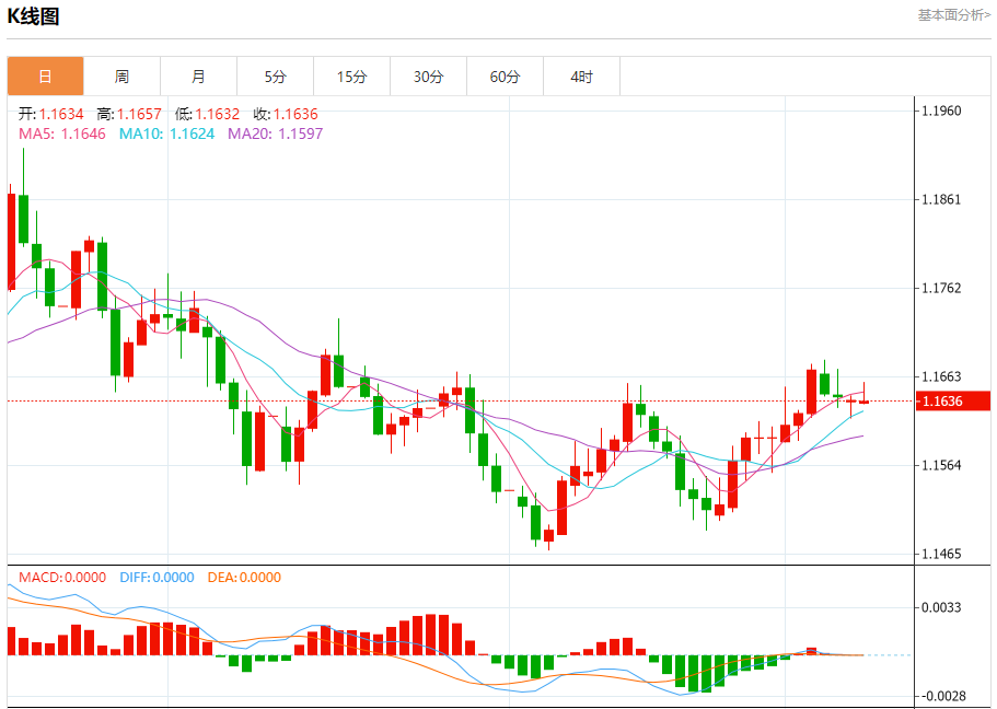 汇价高见1.1657,低见1.1632。上一交易日,汇价收于1.1637。