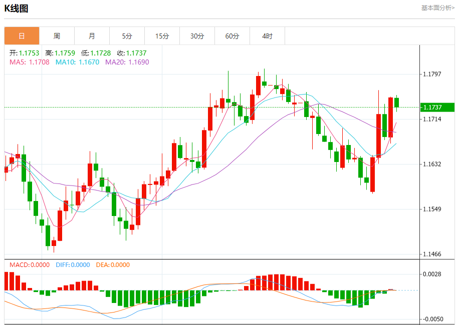 汇价高见1.1759,低见1.1728。上一交易日,汇价收于1.1754。