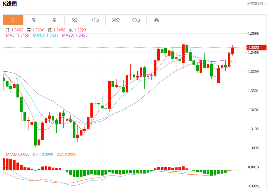 汇价高见1.3536,低见1.3482。上一交易日,汇价收于1.3497。