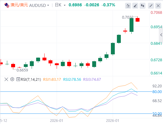澳元/美元日线图分析显示该货币对在上升通道形态内上涨,显示持续多头偏向。14天相对强弱指数(RSI)位于80.27,显示超买,表明动能被拉长。