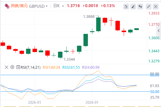 九日指数移动平均线(EMA)位于1.3678,上方50日移动平均线1.3493,价格均守在两者之上。两者均线均向上倾斜,强化趋势强度。动量指标14天相对强弱指数(RSI)位于61.75,保持在50中线以上且无超买读数,确认多头动能。