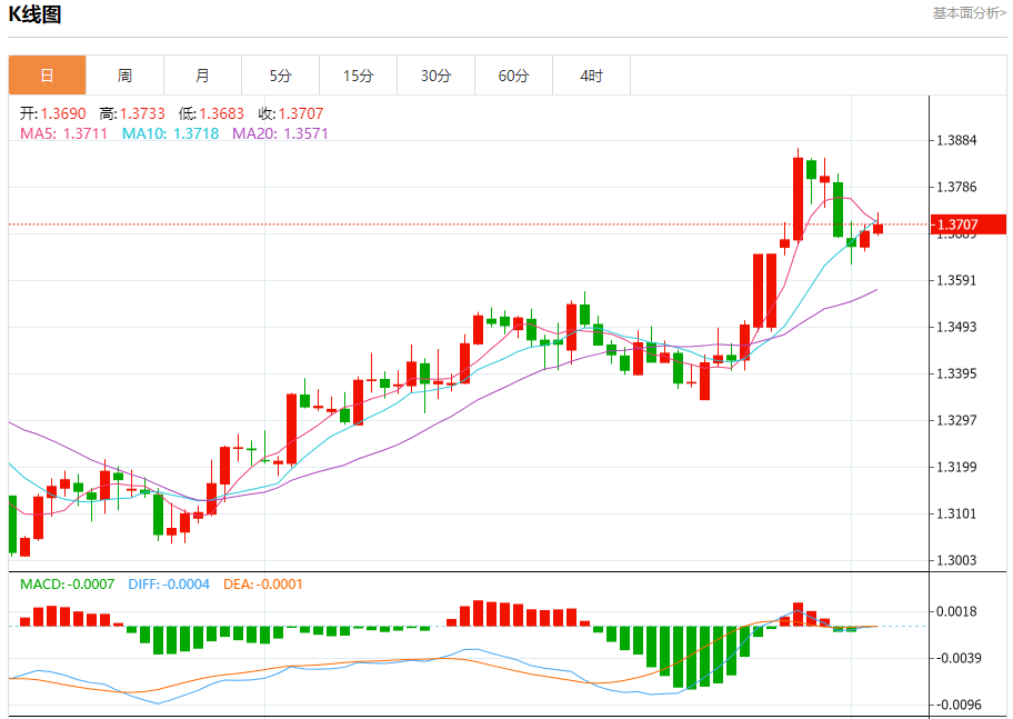 汇价高见1.3733,低见1.3684。上一交易日,汇价收于1.3694。