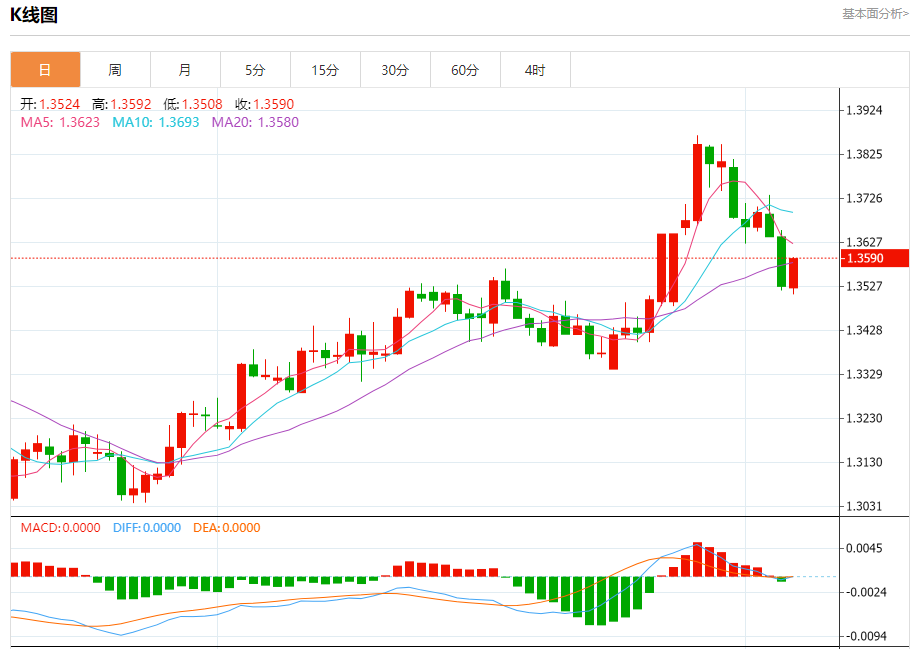 汇价高见1.3592,低见1.3508。上一交易日,汇价收于1.3527。