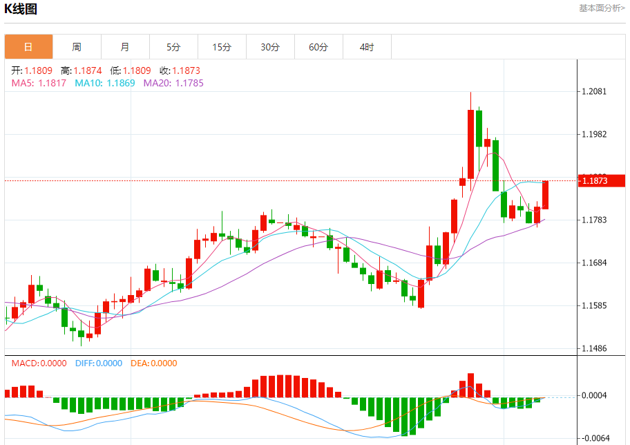 汇价高见1.1875,低见1.1809。上一交易日,汇价收于1.1814。