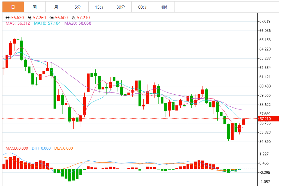 周一(12月22日),美原油价格交投于57.200美元/桶附近,涨幅为1.22%。       原油在最近的盘中交易中上涨,受到相对强弱指标出现积极信号的支持,尽管已达到超买水平,这显示出当前这种主导的