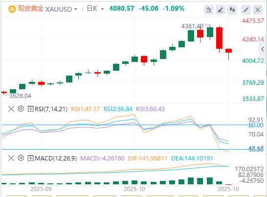 周三亚盘,黄金徘徊在4080.57附近。黄在全球金融市场风云变幻的当下,黄金作为传统避险资产的地位再度面临严峻考验。周二(10月21日)现货黄金价格遭遇重挫,单日跌幅高达5.3%,收于4124美元/盎司,这不仅是近一周的新低,更是自2020年8月以来最大的单日跌幅。盘中金价一度触及4083.15美元/盎司的低点,距离日内高点下跌近300美元,让无数投资者措手不及。这一暴跌并非孤立事件,而是多重因素交织的结果,包括投资者获利了结、避险需求减弱以及宏观经济环境的微妙变化。
