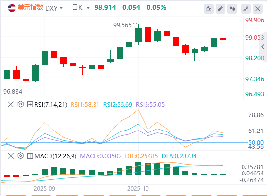 美元指数:截至发稿,美元徘徊在98.91附近。美元指数得益于政策分化带来的支撑,以及美国财政稳定性相关乐观情绪的回升,美元指数在本周五通胀数据公布前,大概率将维持看涨基调。技术面上,美元指数正试图收于阻力位98.85–99.00上方。如果这一尝试成功,美元指数将向下一个阻力位移动,该阻力位位于100.00–100.15区间。