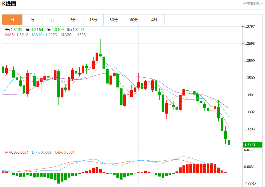 英镑/美元:截止北京时间20:23,英镑/美元下跌,现报1.3114,跌幅0.27%。纽市盘前,在最近一日的盘中交易中,(GBPUSD)价格下跌,在短期内主要的熊市趋势占主导,其价格沿趋势线交易,确认了这一下行趋势的延续,同时由于其价格交易低于EMA50,技术压力持续,当前可持续回升的可能性降低。
